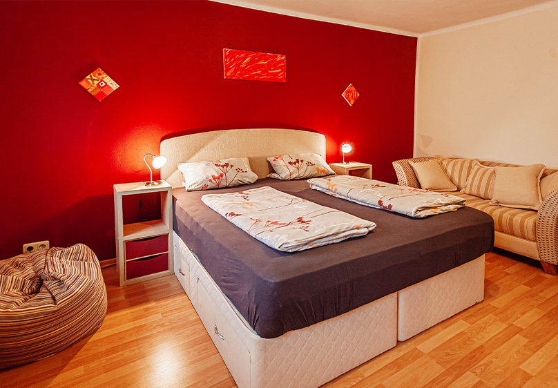 Unsere sehr zentral gelegene 90 m2 Ferienwohnung im Stadtteil Kürenz bietet Ihnen einerseits eine schnelle Anbindung in die Stadt (2 Minuten mit dem Auto und 15 Minuten zu Fuß) und andererseits macht die Nähe zum Petrisberg (ehemalige Landes- gartenschau) Ihren Aufenthalt in Trier zu einem besonderen Erlebnis. Für Romantik und Ruhe sorgt unser großes und gemütliches Schlafzimmer, welches besonders für romantische Stunden zu Zweit genau der richtige Ort ist.